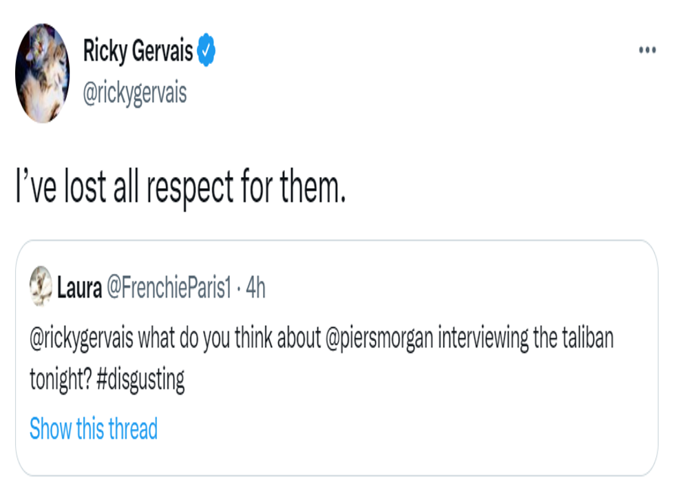12 hours agoRicky Gervais had a cutting response when asked for his thoughts on Piers Morgan s interview with a Taliban spokesman tweeting. Ricky Gervais has hit out at Piers Morgan after he interviewed the official Taliban spokesman on his TalkTV show Uncensored. Ive lost all respect for them.